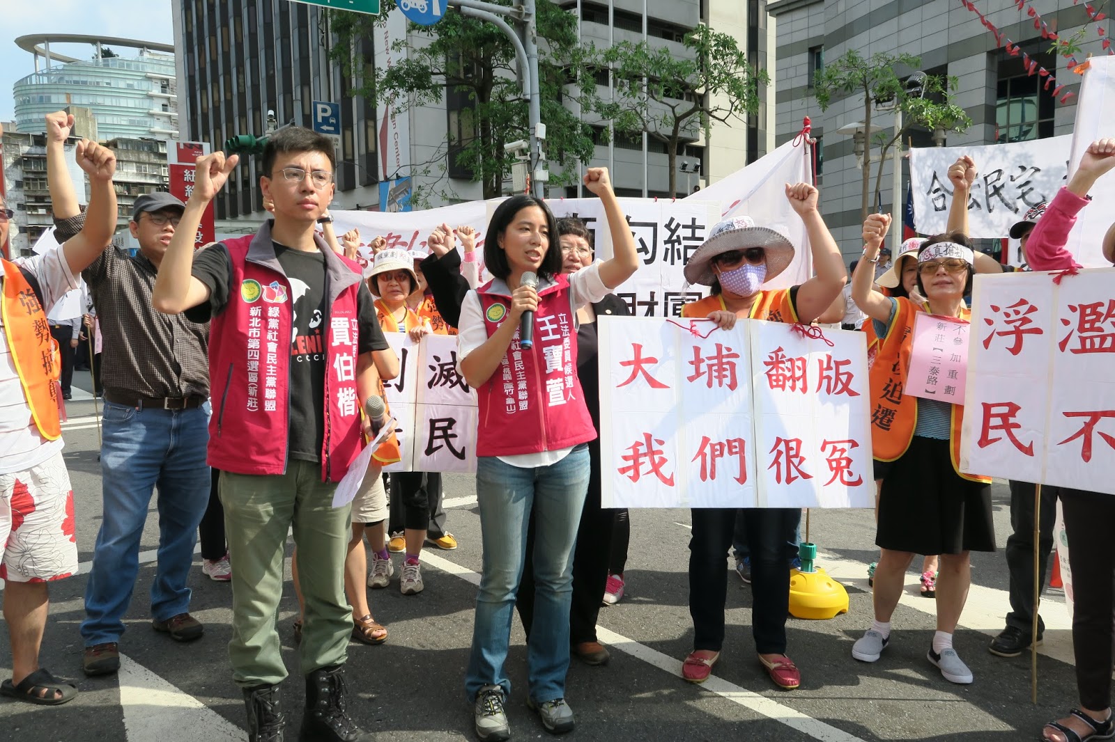 塭仔圳重劃區居民第三次上街頭抗議。桃園市第一選區綠社盟立法委員參選人王寶萱說:「我們願意站出來,並不是反對新莊在地開發,而是反對『迫遷』。」記者會負責人兼綠黨社民黨立法委員參選人賈伯楷、台北市廉政委員王小玉、立法委員周倪安到場聲援。