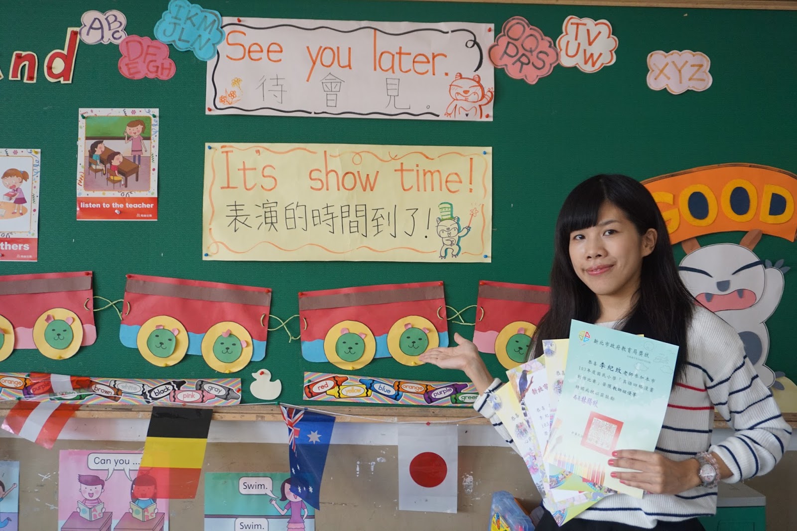 李紀玫不僅設計了許多教學活動,英語教室的佈置、單字卡片、英語四格漫畫、甚至期末發放的小獎品都是她自己設計製作,「每個學期小朋友都在認真的積點數,所以我也想給他們每個人最獨一無二的禮物」,她說,「做這些要花錢、花時間、花心力,但我不怕累,就怕他們學不會。」