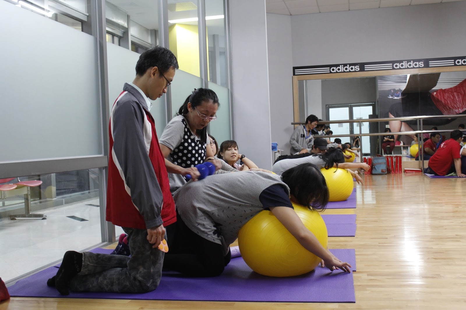 ▲前馬偕醫院護理長陳崇萱教導準媽媽利用生產球做舒壓按摩。