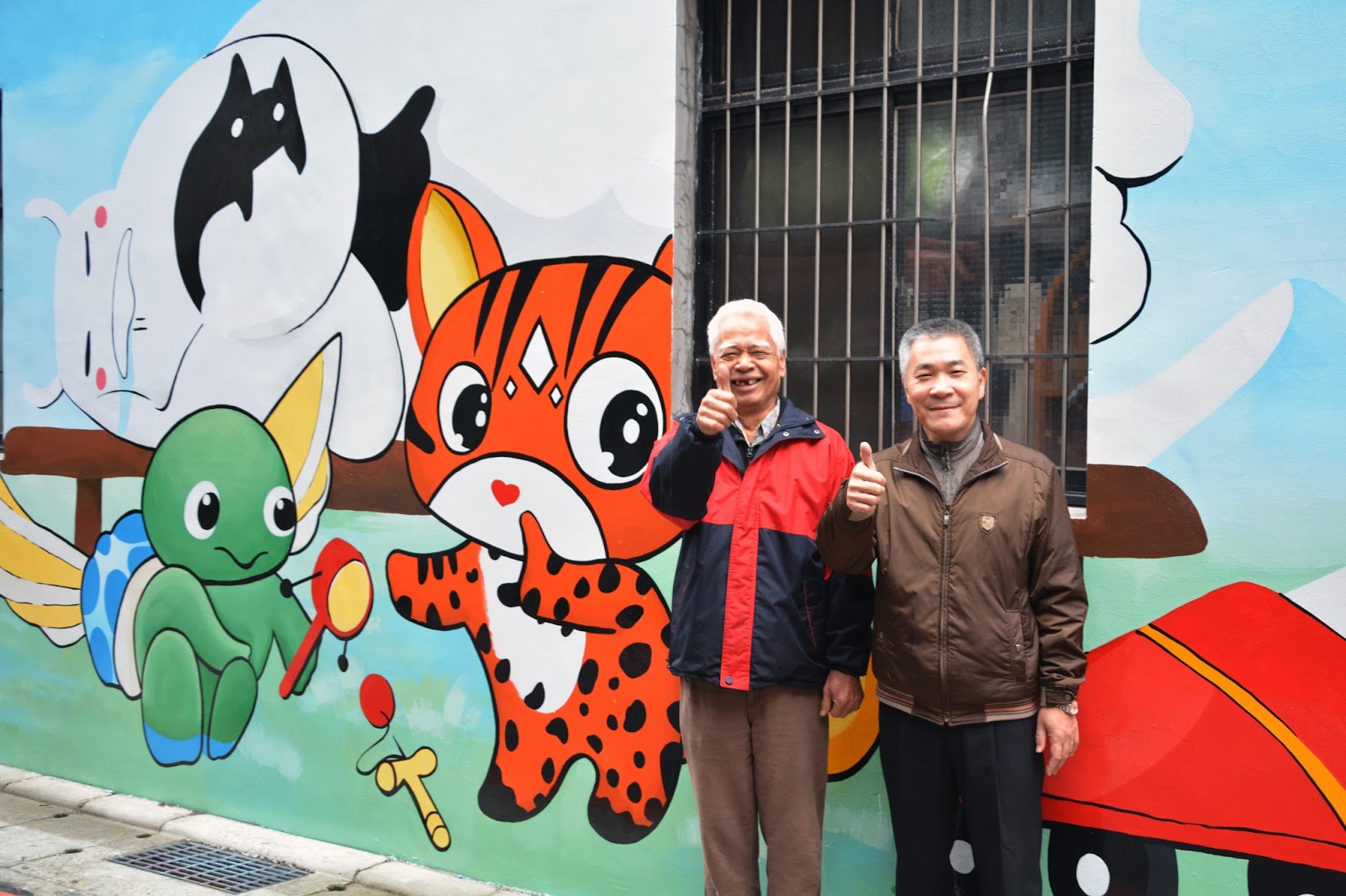 ▲祥鳳里里長賴俊良(圖右)和里民陳先生站在祥鳳里的彩繪牆前。