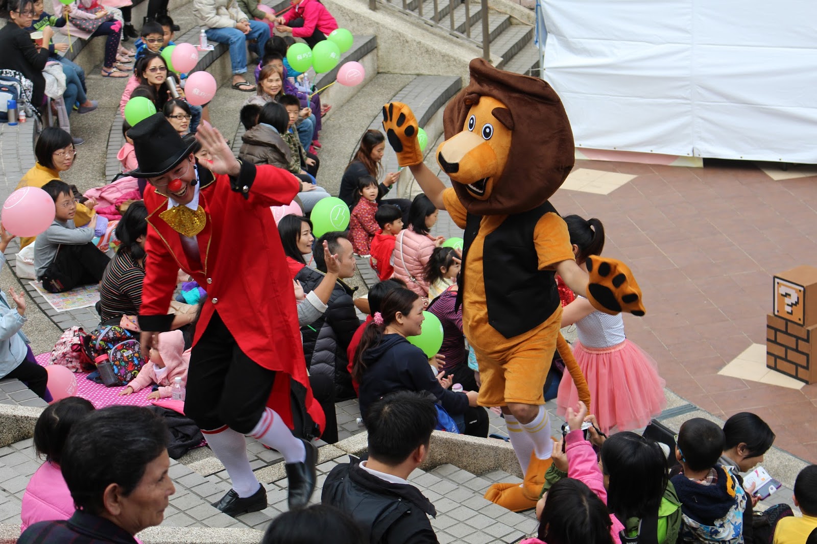 蘇巧慧指了台階上兩個穿紅色背心的小孩說:「那兩個是我的女兒,他們都會來看這些表演,而且覺得相當好玩。」蘇巧慧競選總部文宣組負責人蔡咏諭表示,西盛圖書館旁民眾的流動量很大,有興趣便會來觀賞。黃姓小朋友說,近距離的互動讓他感覺十分有趣。