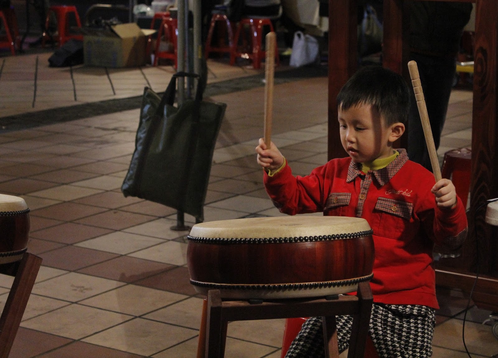 ▲小朋友在响仁和鐘鼓廠攤位體驗打鼓樂趣。 攝影/林奕廷
