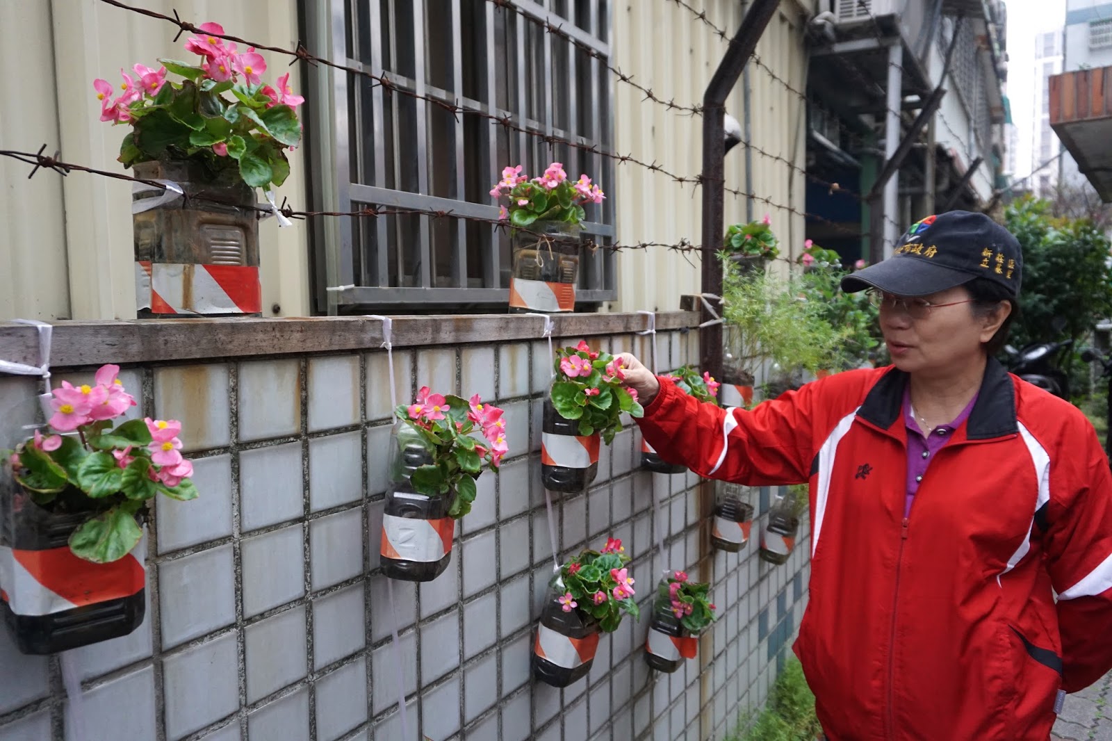 玩花種草是張中貞的興趣,除了淨化都市空氣,也讓經過的人賞心悅目。張中貞自己設計不同樣式,將不同花和綠色植物排成各種形狀,和志工里民一同植種、修剪。她說,種聖誕紅響應聖誕節氣氛;麒麟花、四季海棠和黃金葛能開至明年四、五月,生命期長;牽牛花則攀藤社區的「綠牆」,增加繽紛色彩。