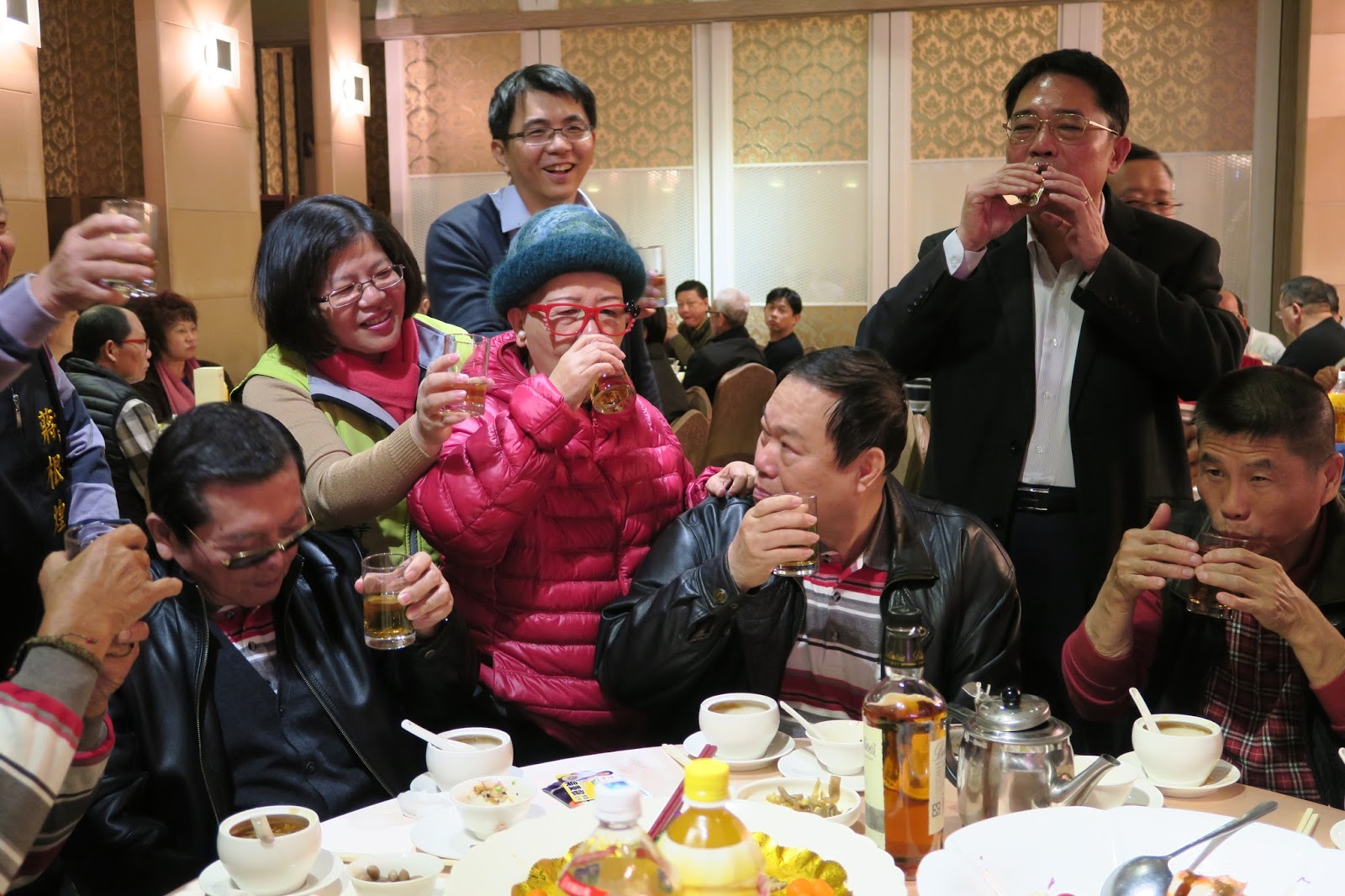 新莊廟街發展協會理事長蔡易陳(左三後排)一同向民眾敬酒。