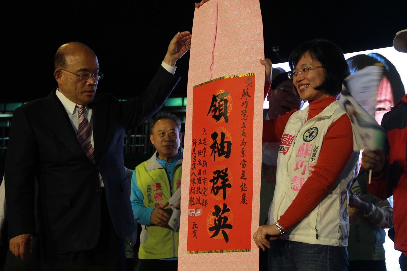 她的父親蘇貞昌也特別來到現場感謝大家:「給蘇巧慧進國會的機會,希望巧慧能帶給第五選區的選民最大的幸福。」帶著孩子一起來看開票的黃小姐說:「我很喜歡蘇巧慧的教育政策,希望她當選後真的能給孩子新未來。」