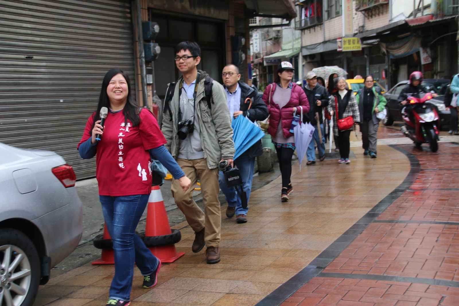 ▲走讀解說員蔡婉筠(左一)與邱冠霖(左二)沿路帶領民眾訪視新莊廟街的建築與店家。