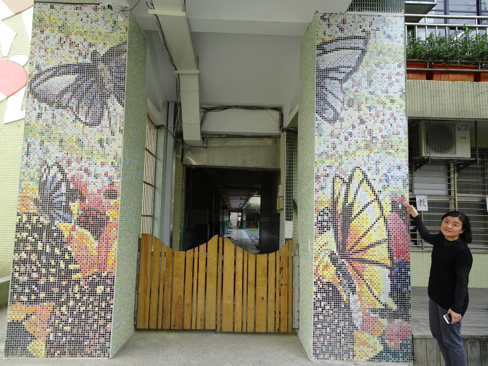▲中港國小總務主任徐雪櫻介紹校門前柱子上蝴蝶圖案的涵義,希望孩子