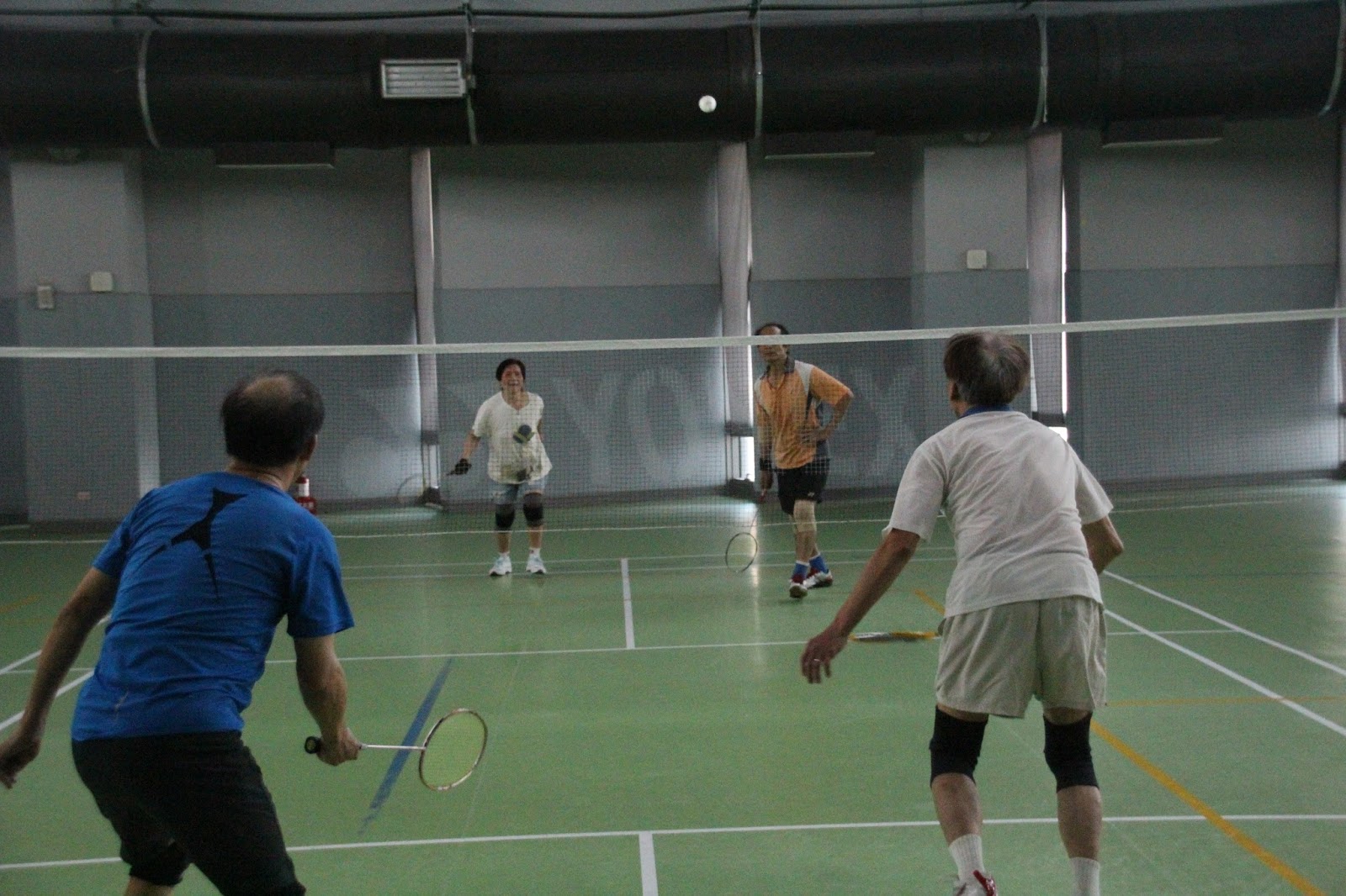 ▲「老小子羽球隊」使用新莊國民運動中心羽球館公益時段,活動筋骨。