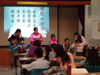 ▲中泰里先德親子經典讀經班上課情況,志工老師許玉萍(左)帶領學生讀經。