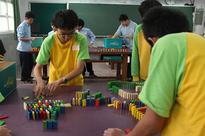 三月初進行的初賽將七年級各班的參賽組先篩選過一遍,月底進入決賽的組別只剩下六個班級,從初賽的五百片骨牌增加到決賽的一千片,三十分鐘的時間,考驗的是學生們的耐力及同組成員間的密切合作。