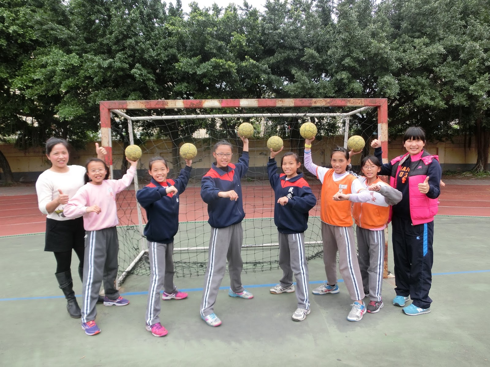 手球隊教練何郁珍在比賽前集合訓話,她對小隊員們說:「我們辛苦這麼久每天訓練沒有假日為了是什麼?就是打場漂亮的比賽為學校拿下一座獎盃。要慢慢一步一步往上爬,告訴大家我們民安國小手球隊一定可以拿冠軍!」