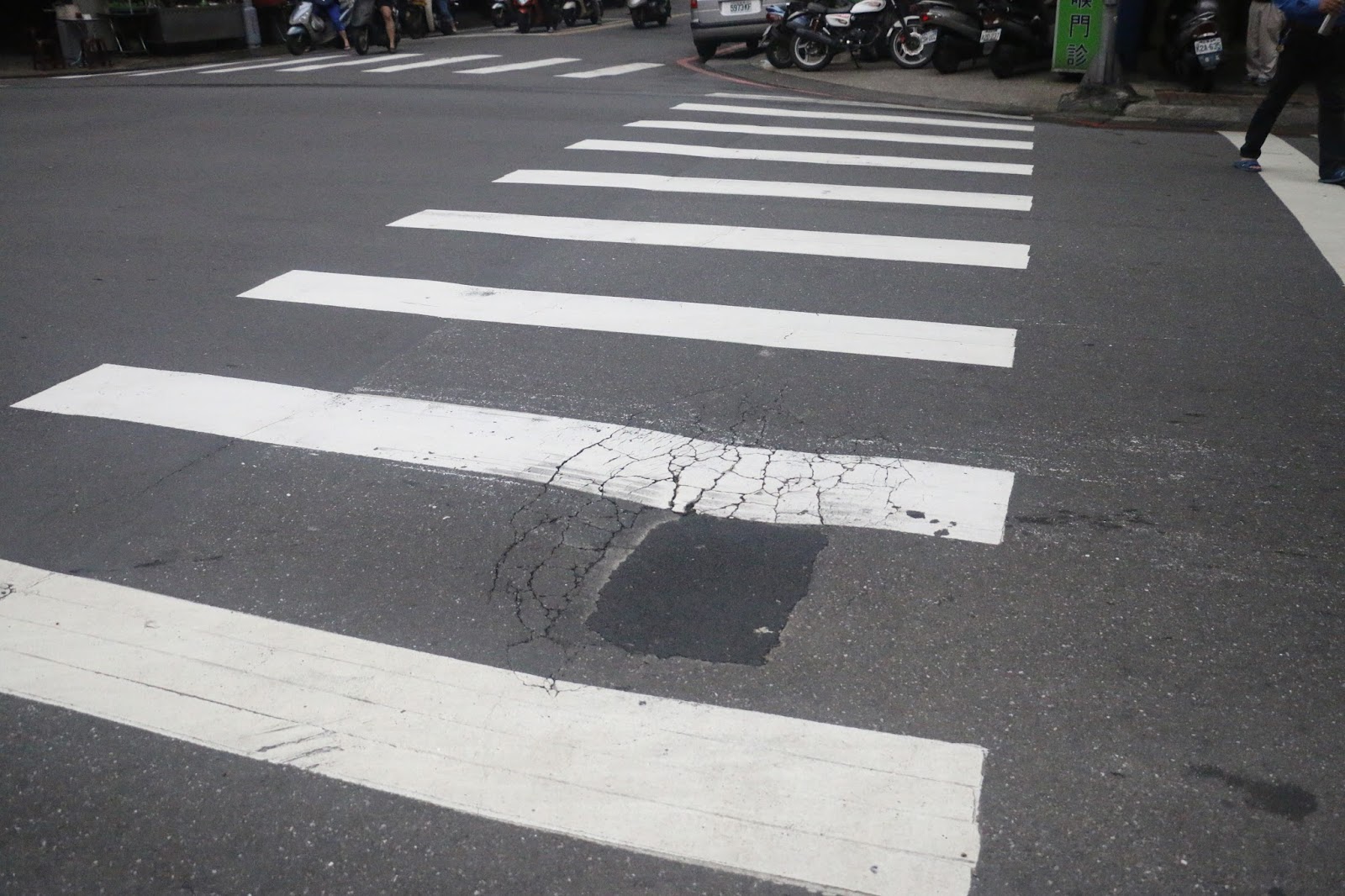 ▲新莊幸福路與福壽街口,路面破損嚴重,曾導致騎士行進至此摔車,