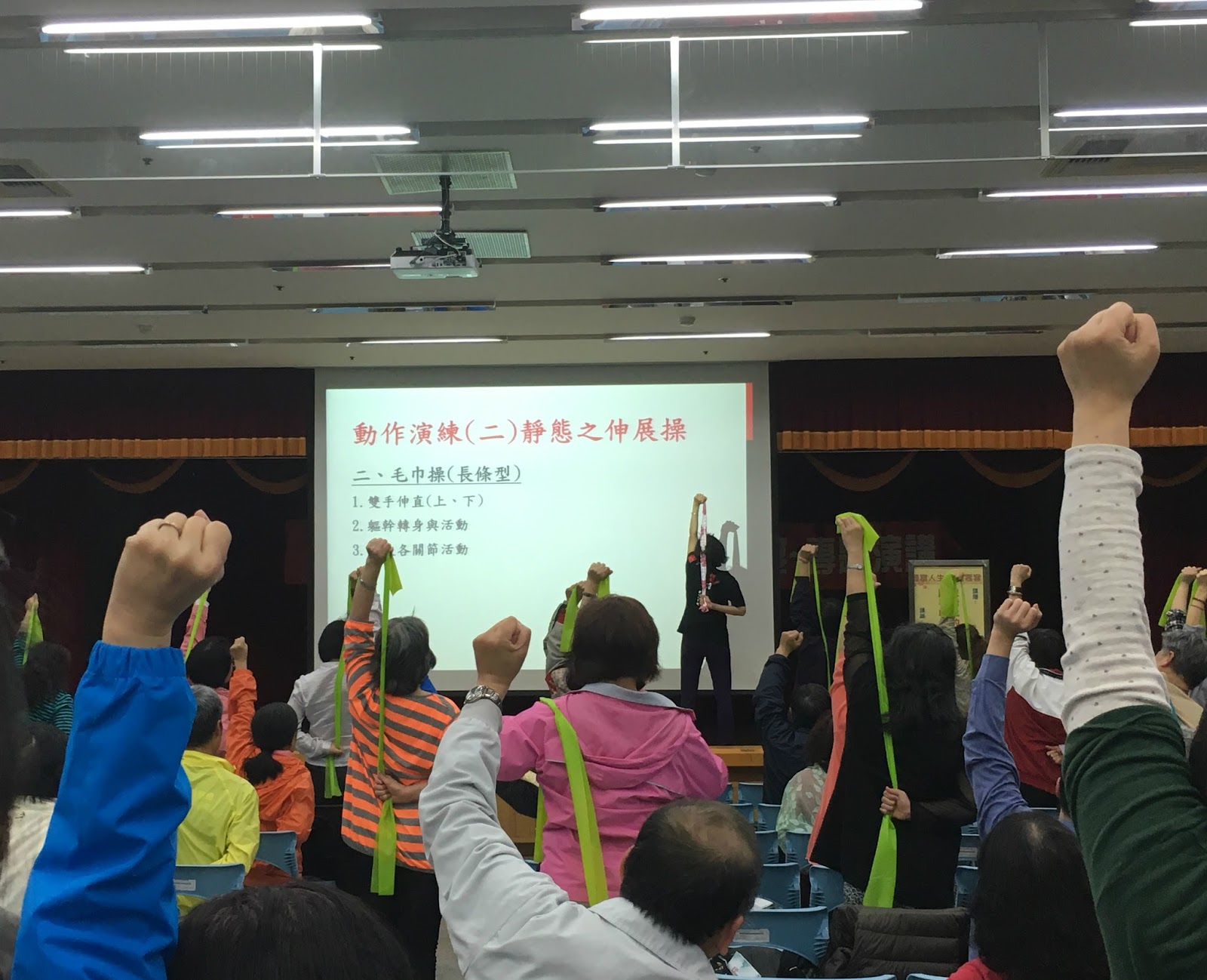 最後,劉麗雲帶領民眾做靜態動作演練,包含上、下肢關節活動、臉部按摩、軀幹伸展等,也帶著大家一起做毛巾操。劉麗雲說,她很建議利用生活中隨手可得的小物運動,例如:推牆壁伏地挺身,或是毛巾、小球等物品,不一定要花錢去俱樂部健身,在家就能輕鬆享受運動的樂趣。