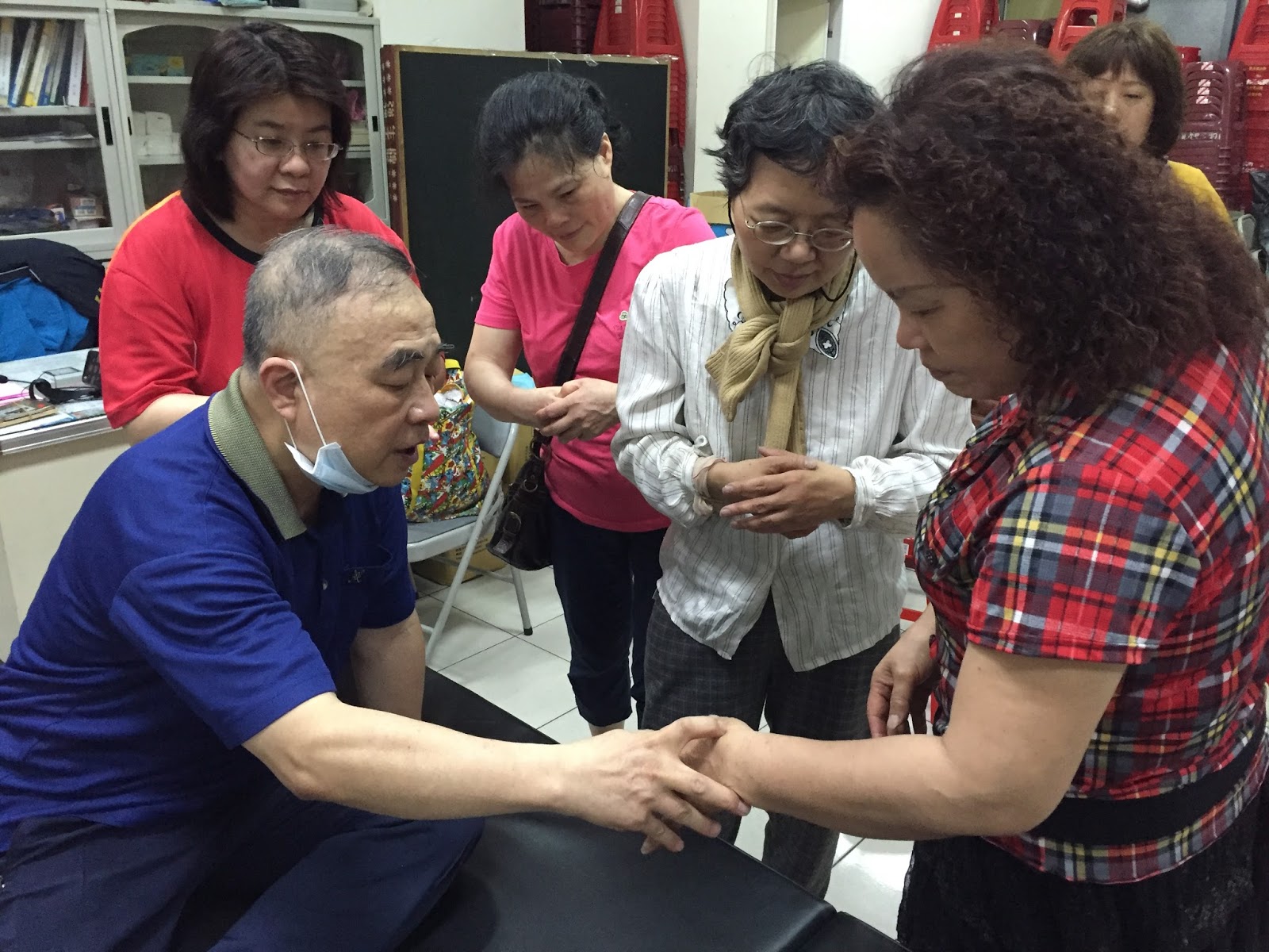 ▲整復師陳獻滄(左一)示範如何在家進行簡單的按摩推拿。