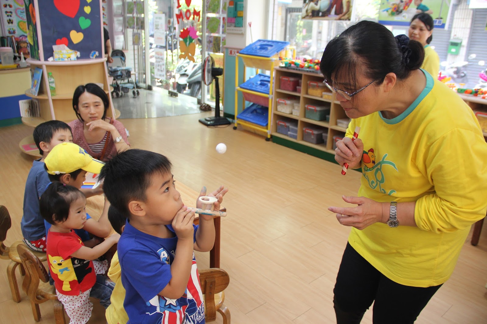 親子教室五月七日以科學為主題,教大家製作飄浮球玩具。老師透過生活中的吹風機與乒乓球帶小朋友認識浮力,並機會教育如何正確使用吹風機,接著發下材料包讓孩子家長一同組裝:空心木棍鑽洞,裝上木棒當支架,再將寶力龍球置於頂端,一吹氣,球就浮起來了,簡易的科學原理讓小朋友們倍感新奇。