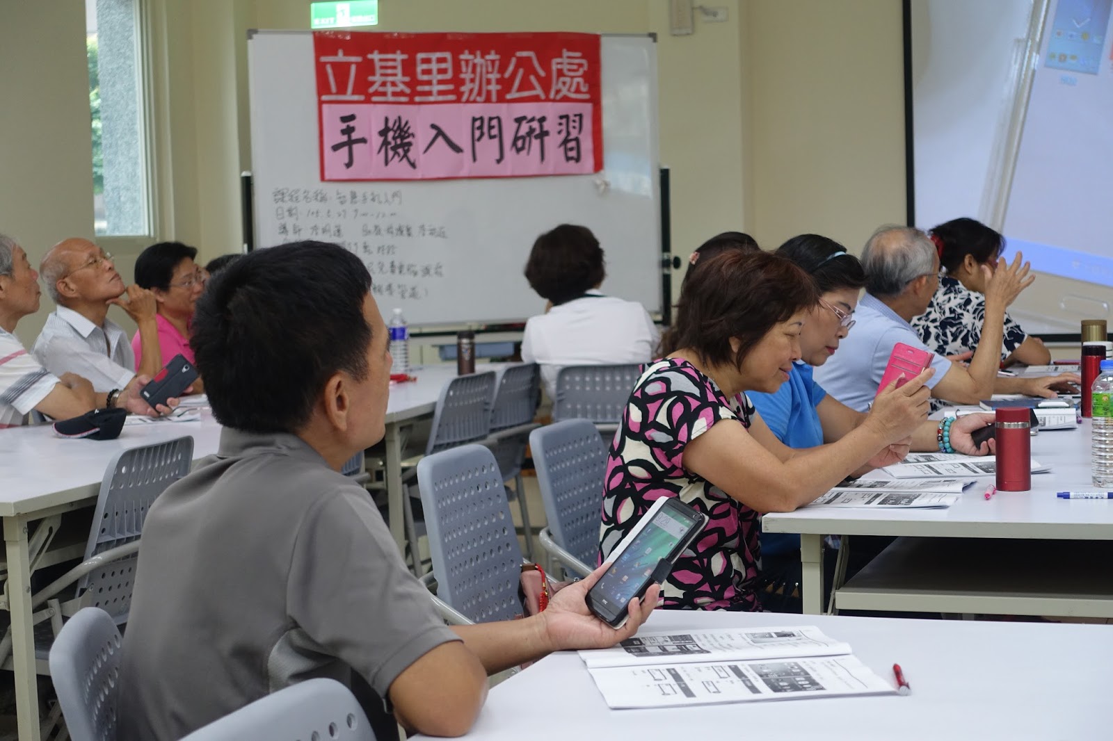 「手機入門」是立基里主辦的第二場研習活動,報名人數超出預期,吸引許多里上中年或老年長者參與,每個人都配有一紙本操作手冊,搭配講師的簡報講解,讓大家更能清楚地理解講師所表達的教學內容。