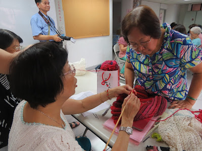 ▲圖為毛編老師蔡玉葉(左)教導學員編織。