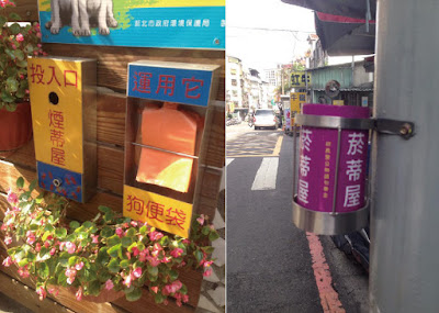 ▲右為里長設計的煙蒂盒與狗便袋盒;左為第二代,茶葉罐回收而成的