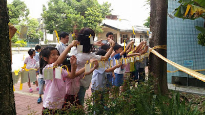 ▲小朋友們正在香蕉樹前繫上追思卡片與黃絲帶。