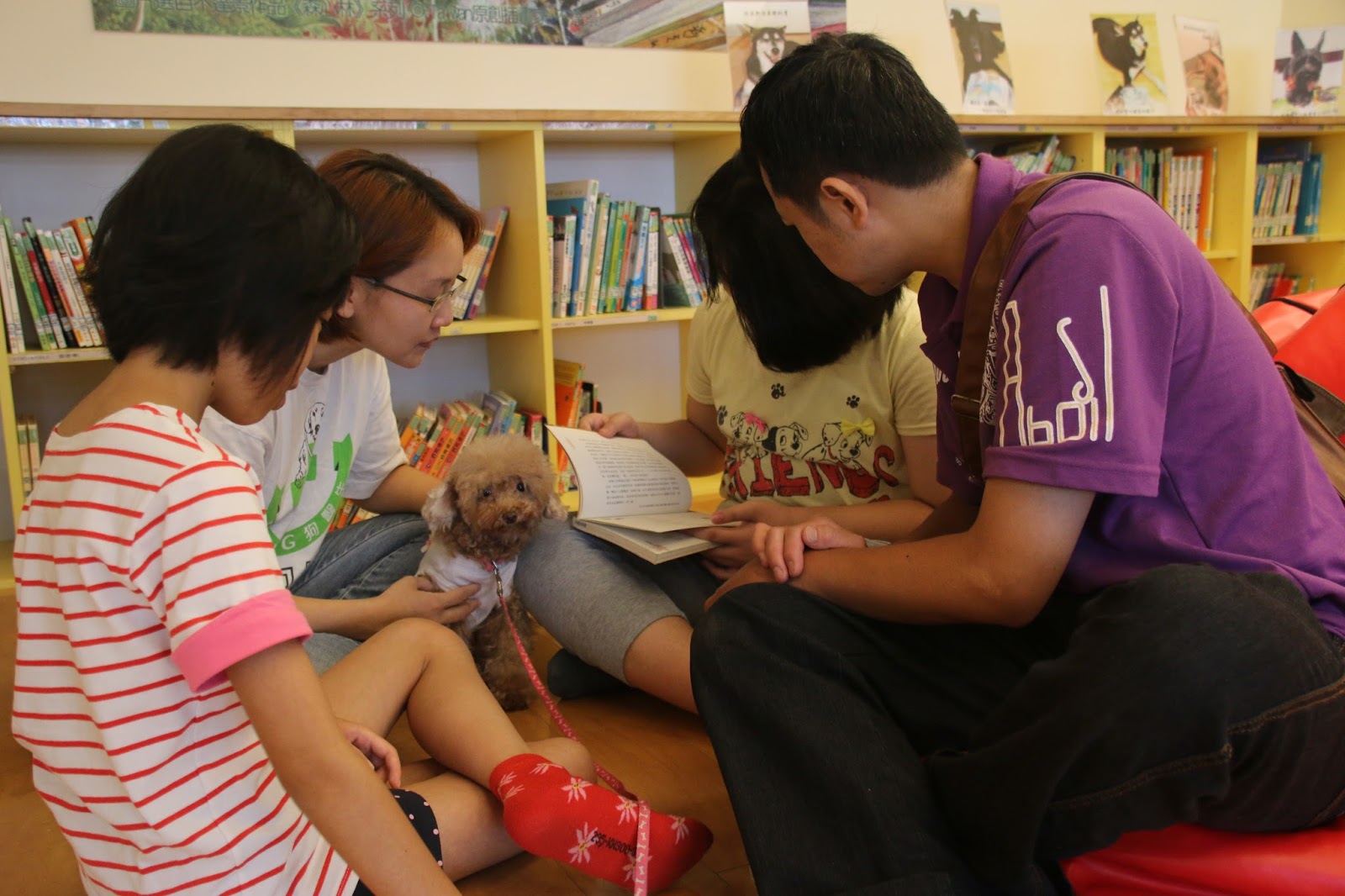 ▲在小遊戲後,林爸爸帶著女兒與治療犬一起閱讀書籍。