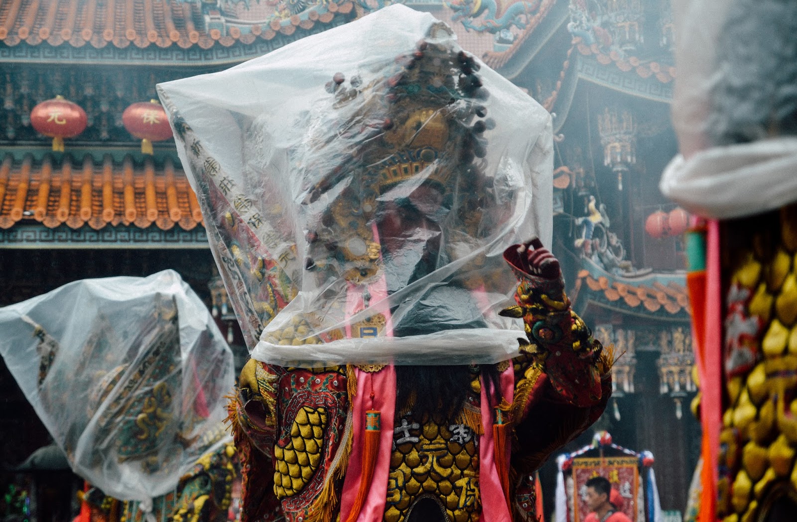 ▲首次池府王爺遶境卻遇暴雨,只好以塑膠袋權充陣頭的雨具。