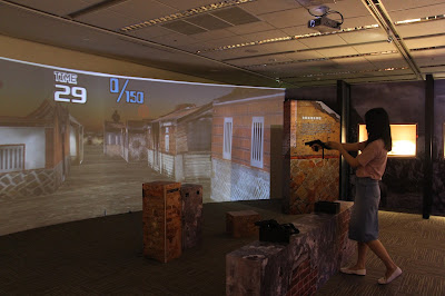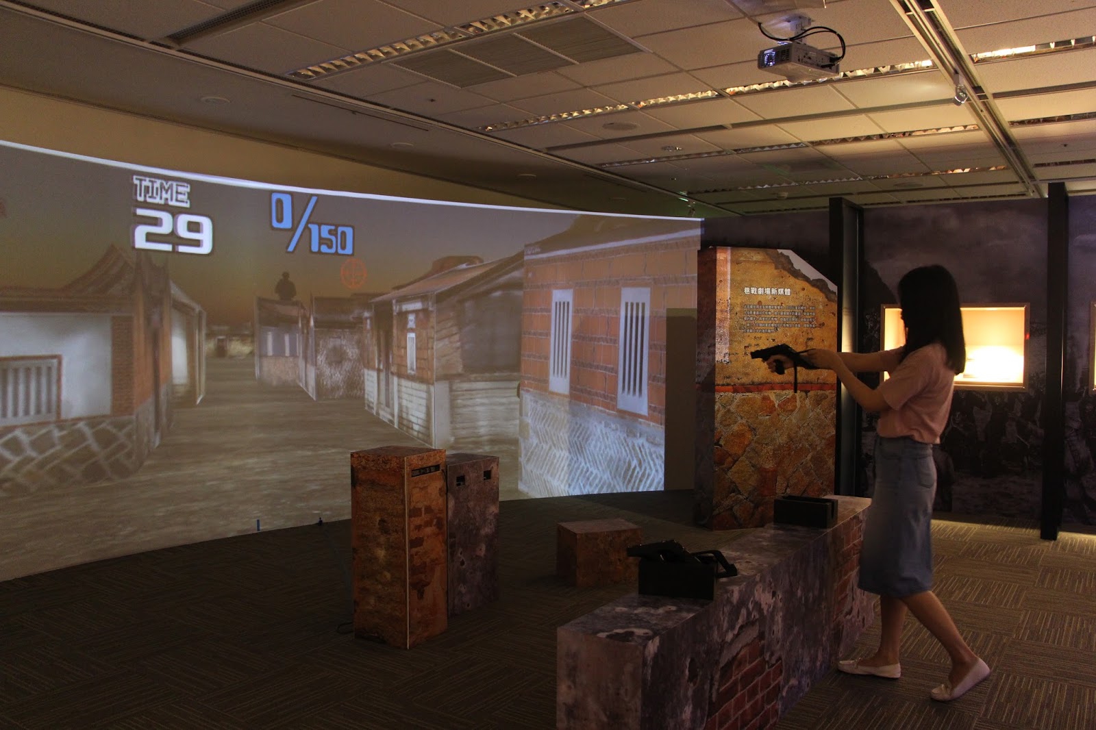 ▲《關鍵56小時──古寧頭戰役》展覽,將檔案結合數位新媒體。圖為民眾體驗巷戰模擬射擊