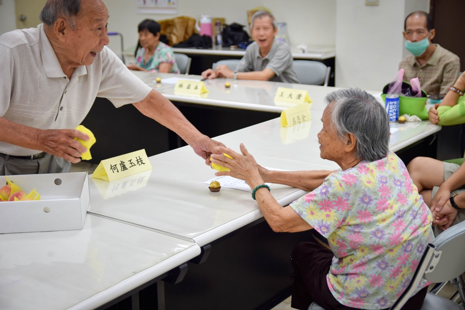 陳正修爺爺說:「在這裡上課很開心,可以認識新朋友。」成果展中氣氛溫馨和樂,不只是薪火相傳班的結業典禮,也是失智長者們的同樂會,大家特別帶來許多新鮮水果和餅乾零食彼此分享,並一同觀看懷舊課程的相片回顧。