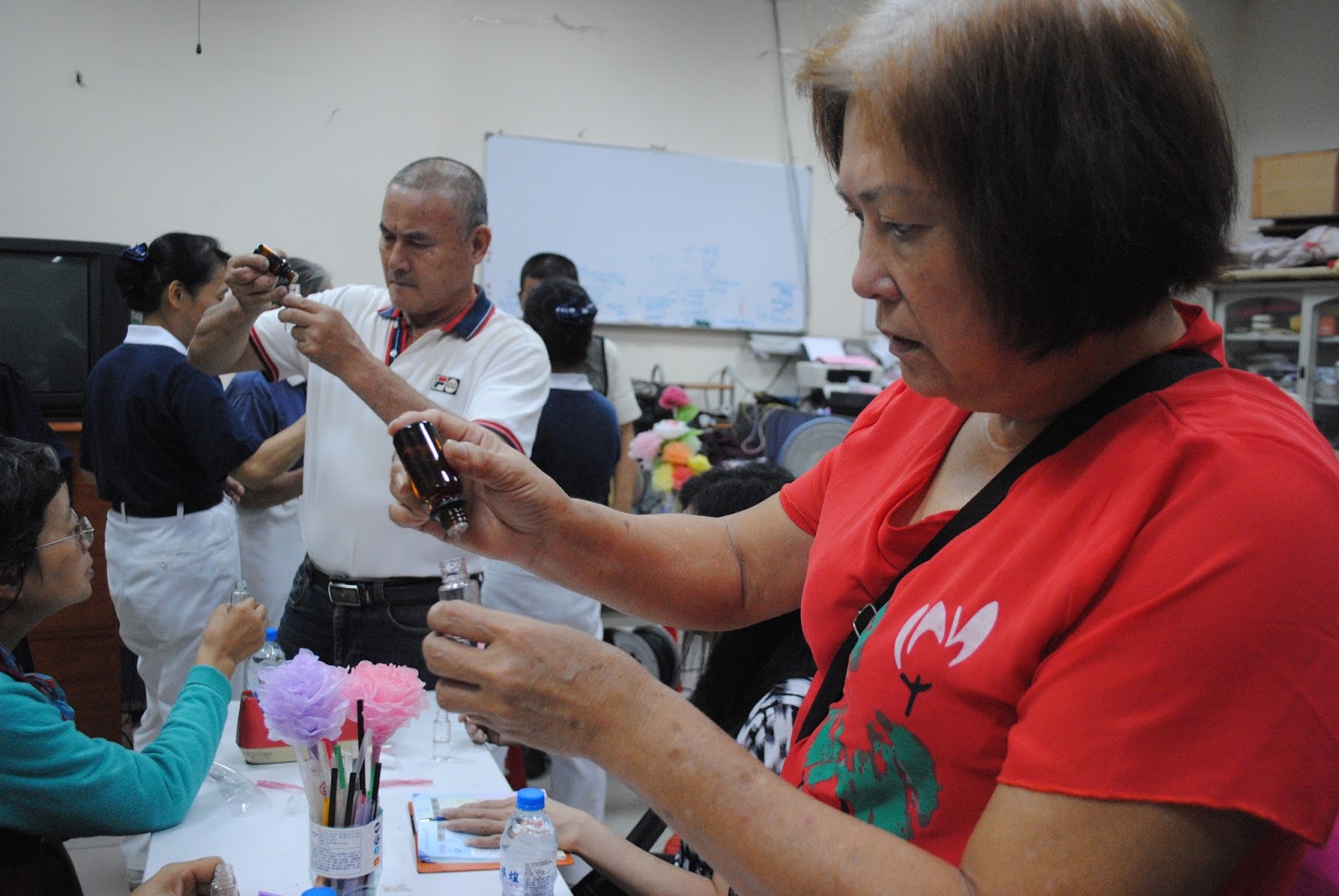 ▲製作防蚊液時里民互相幫忙對方滴精油