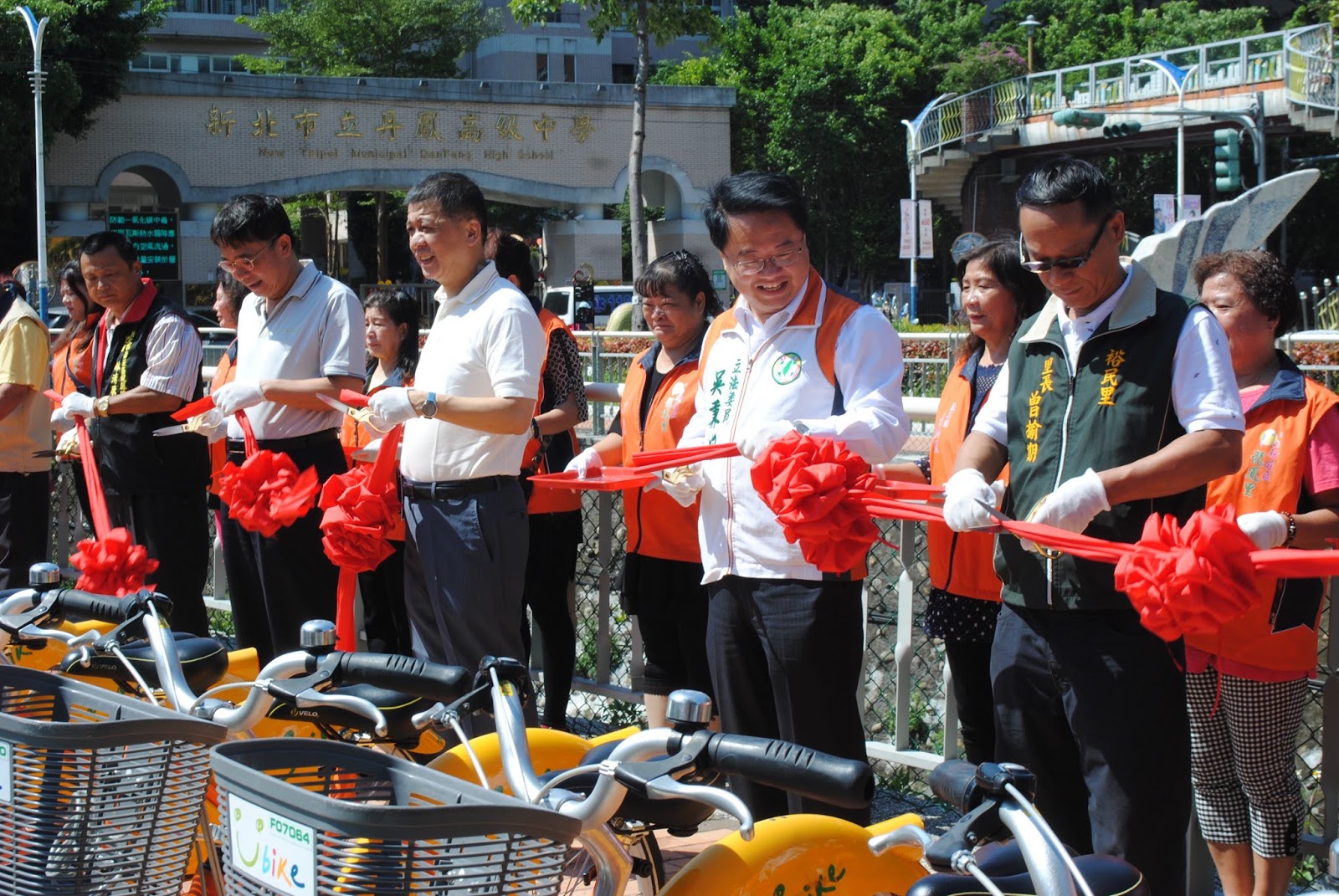 ▲龍鳳公園新設Youbike租借站,多位來賓共同剪綵。左起依序為龍鳳里里長林清原、新莊區長李正勳、新北市副議長陳文治、立法委員吳秉叡、裕民里里長曾榆期