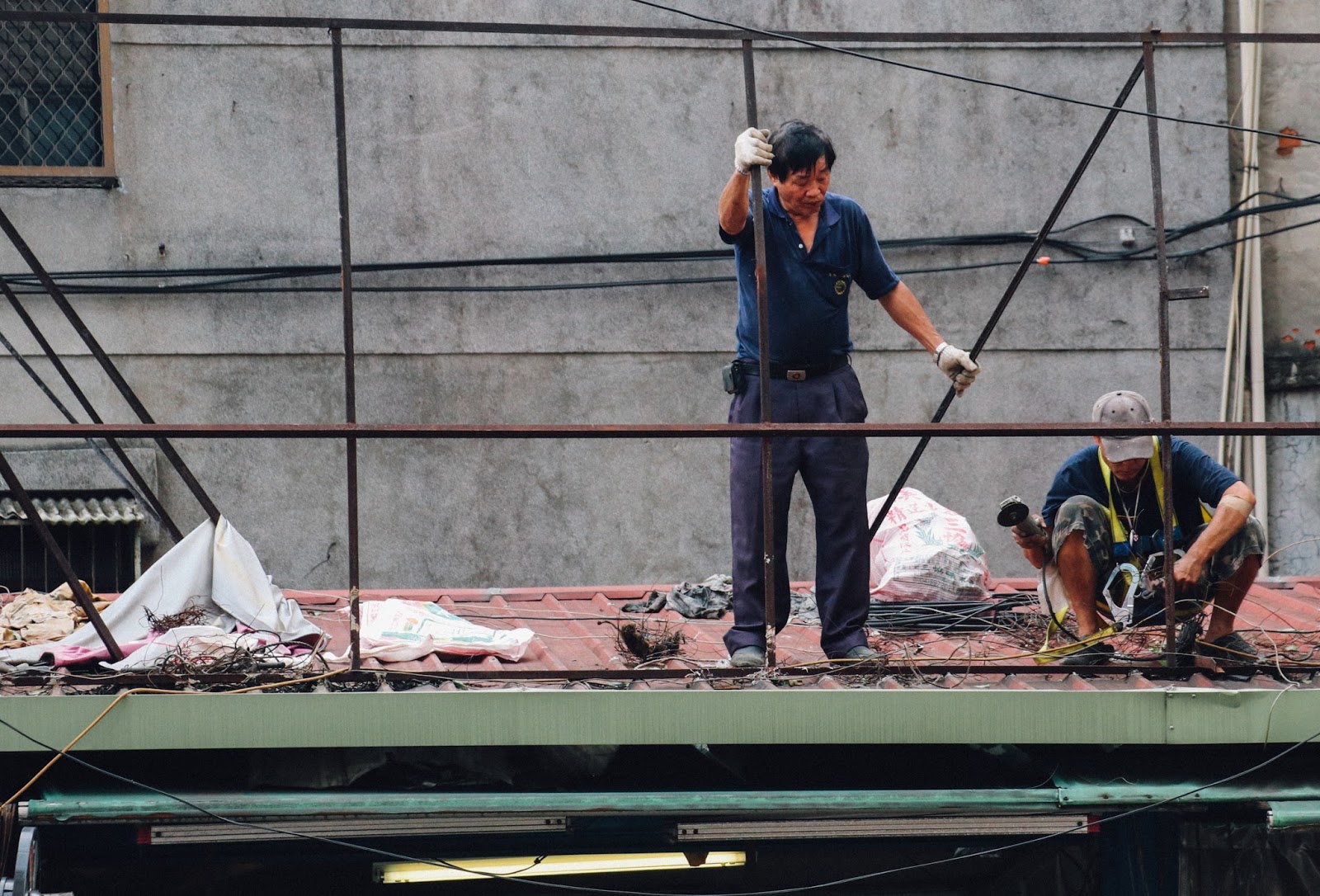 圖為廿八日梅姬颱風過境後,工人們於思源路修葺被狂風暴雨摧殘後的商店屋頂。
