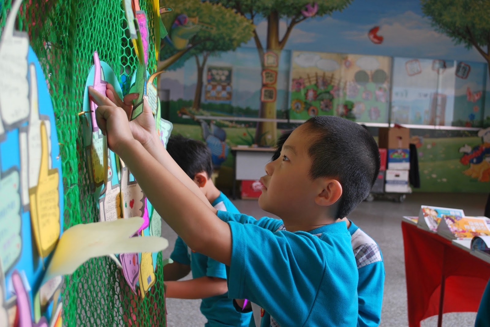 ▲中信國小學生參與「老師您最讚」,在牆上張貼寫給老師的心意卡。