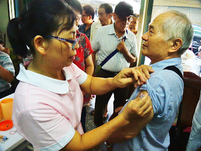 【記者李宜秦報導】中誠里十月二日上午十時施打流感疫苗,只要年滿五十歲的里民即可免費接種。里長辦公室外聚集許多里民,郭小姐說:「打針以後真的比較少感冒了。」