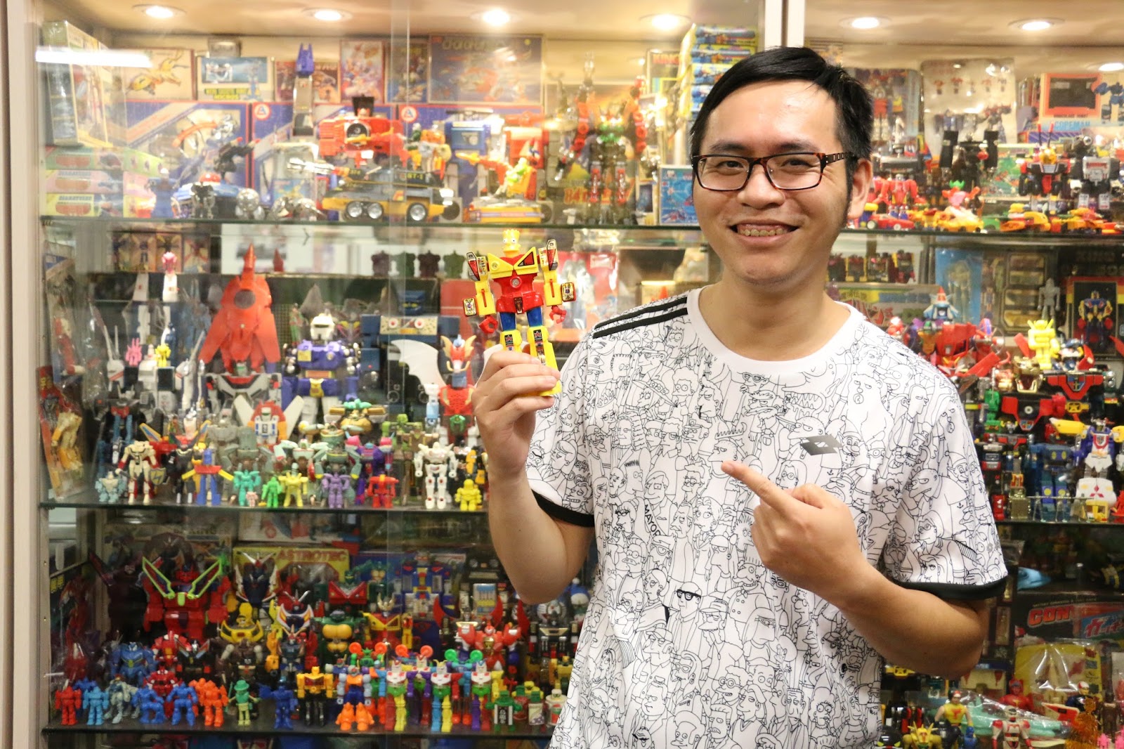 ▲《鋼彈不卡彈》老闆老調衙手拿盜版「銀河疾風」玩具,與他收藏的台灣盜版玩具合影。