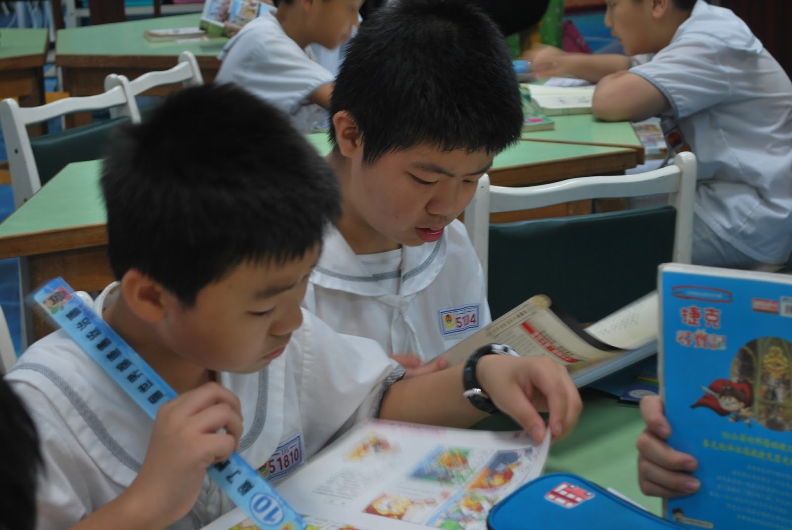 除了《國語日報》,榮富國小每個班級還有兩個書箱,一個是班級書箱,由導師挑選圖書給學生閱讀;一個是輪讀書箱,由圖書館提供書籍,每個班輪流閱讀後再還回。此外,每週都有一節閱讀課,由志工媽媽陪伴學生在圖書館讀書。