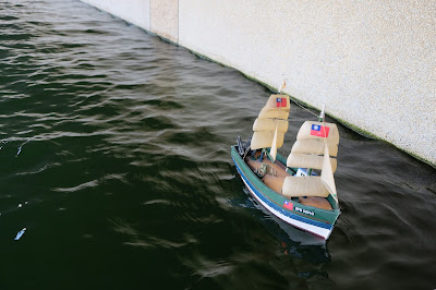 雙十國慶前,有民眾將自製國旗圖樣貼於船帆,讓模型乘載著青天白日滿地紅在水中馳騁。國旗遙控船提早為中港大排的居民拉開雙十國慶序幕。