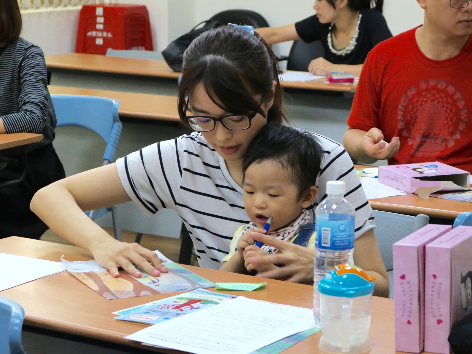 蔡延治教現場家長手指謠、剪刀石頭布歌,鼓勵家長陪孩子玩,並教導家長簡易DIY,讓家長能與小孩動手做。