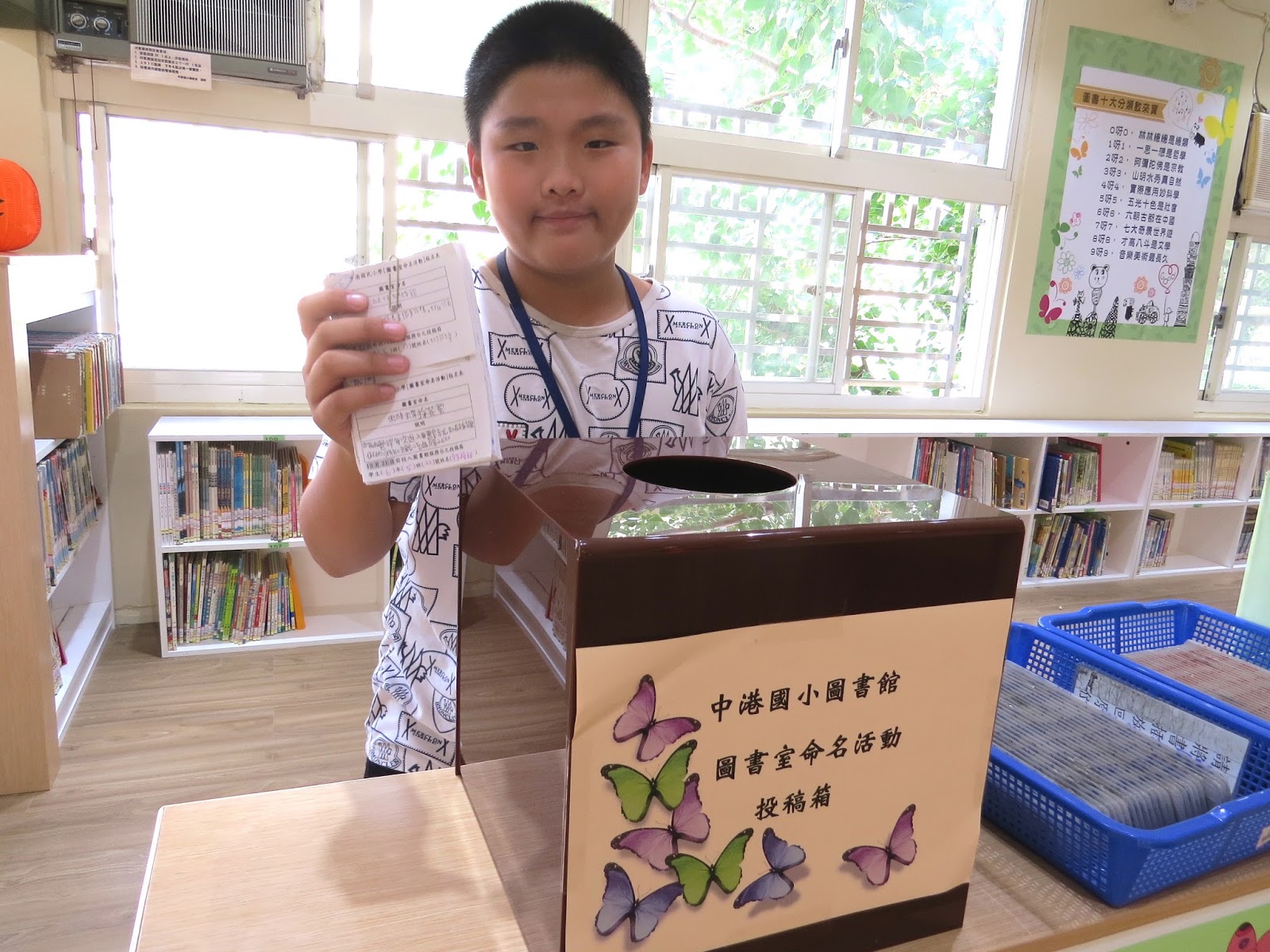 ▲六年五班蔡文賓,幫全班同學將命名單投至圖書館的徵選箱。
