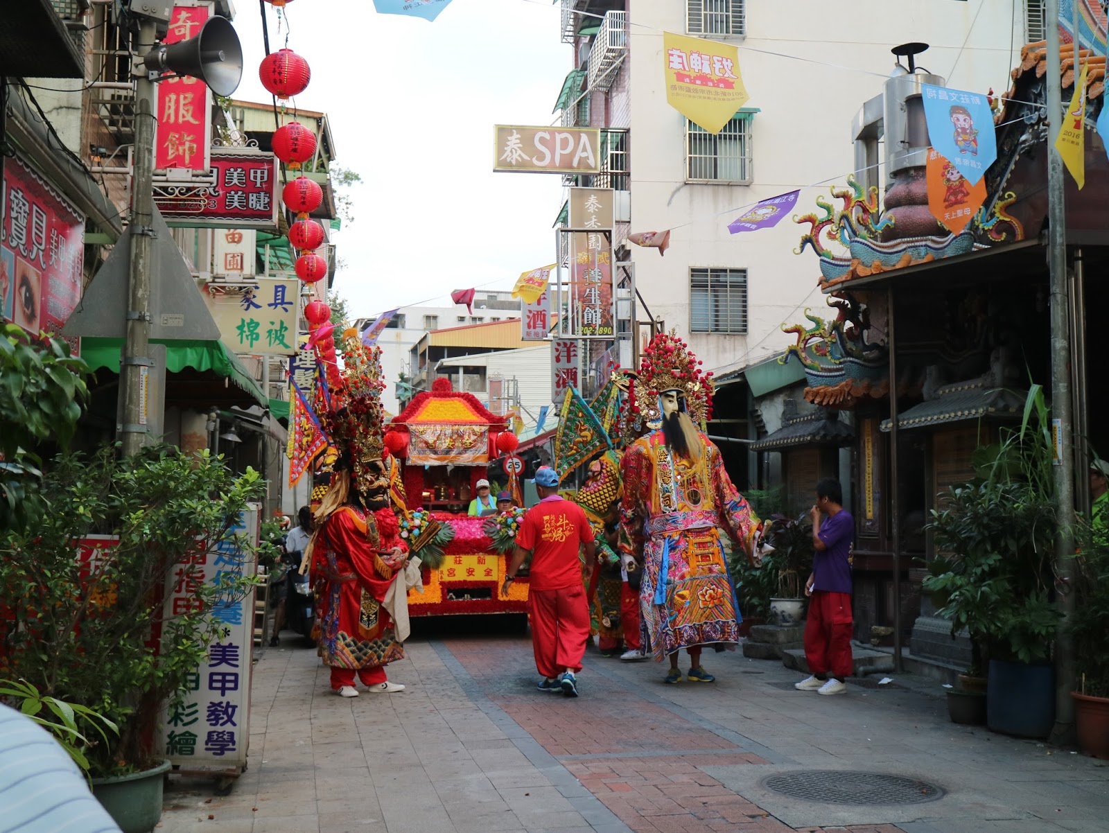 ▲台南永華宮環台祈福,新莊公館口全安宮助陣,李府星君、關聖帝君、土地公及七爺八爺出巡,繞境隊伍經過新莊廟街。