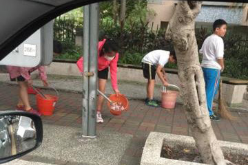 ▲新莊國小的學生正在清掃廟會活動的垃圾。
