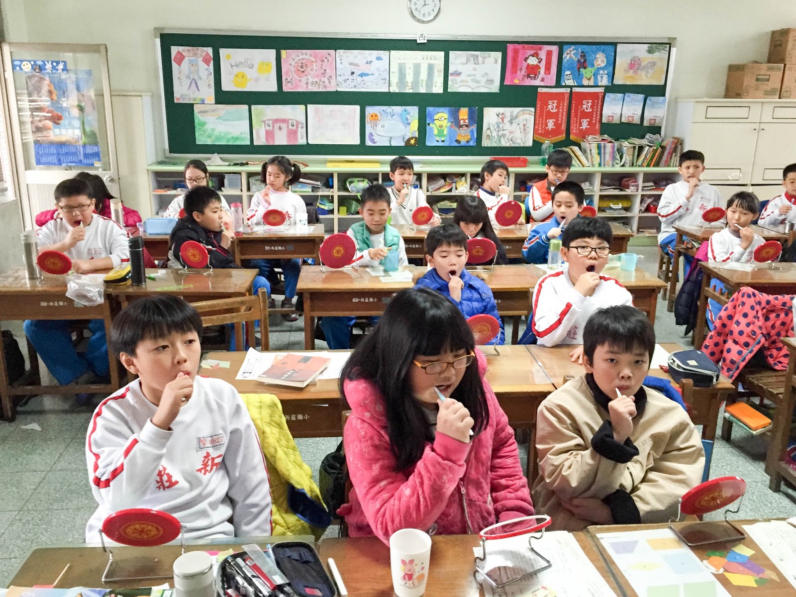 ▲新莊國小提供學生小鏡子,練習如何正確刷牙。