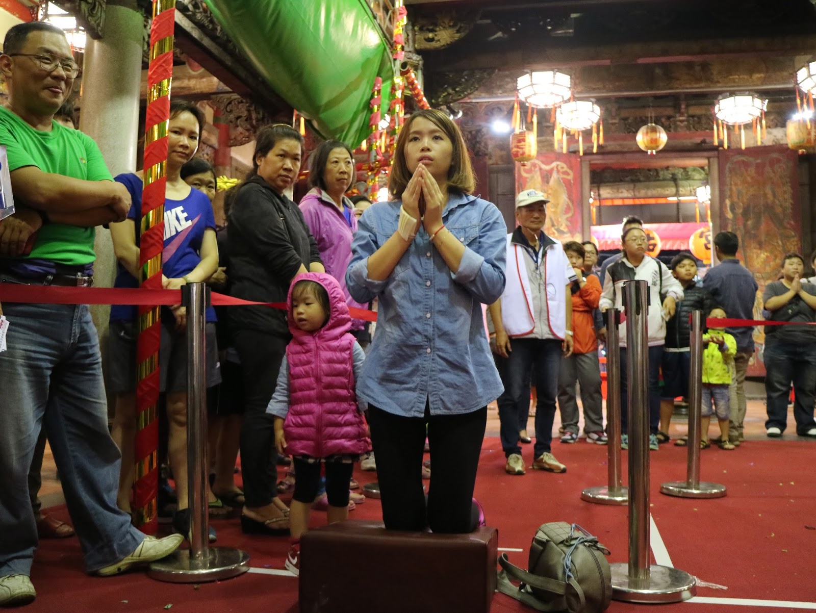 慈祐宮擲筊比賽,信徒擲筊前先虔誠祝禱。攝影/高昱晴