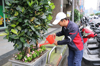 ▲昌信里里長柯明啟為綠化道路的秋海棠盆栽澆水。