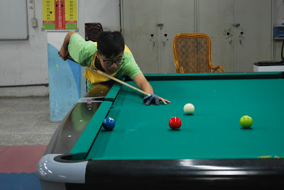十一月九日下午放學後,頭前國中地下的撞球教室響起了擊球聲。撞球教室中有十張球台,其中靠近前面的四張,各有二名學生在練習;後面六張,則每張都圍滿了學生。吳海山說,本來一張球台不該超過兩個人;但現在隊員太多,設備超負荷,只有「拔尖的」學生能保證兩人一張。