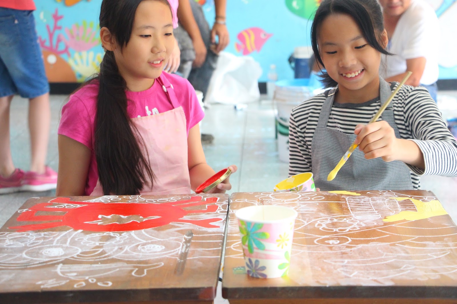 彩繪桌子給學生發揮想像力的空間,從打草稿到上水泥漆都由學生負責。海洋世界的主題激發學生天馬行空的想像力,將腦袋中的海底風光畫下來,成為藝文空間最美麗的佈置。