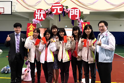 ▲丹鳳高中高三生熱情與校長曾慧媚(左四)在狀元門前合影。