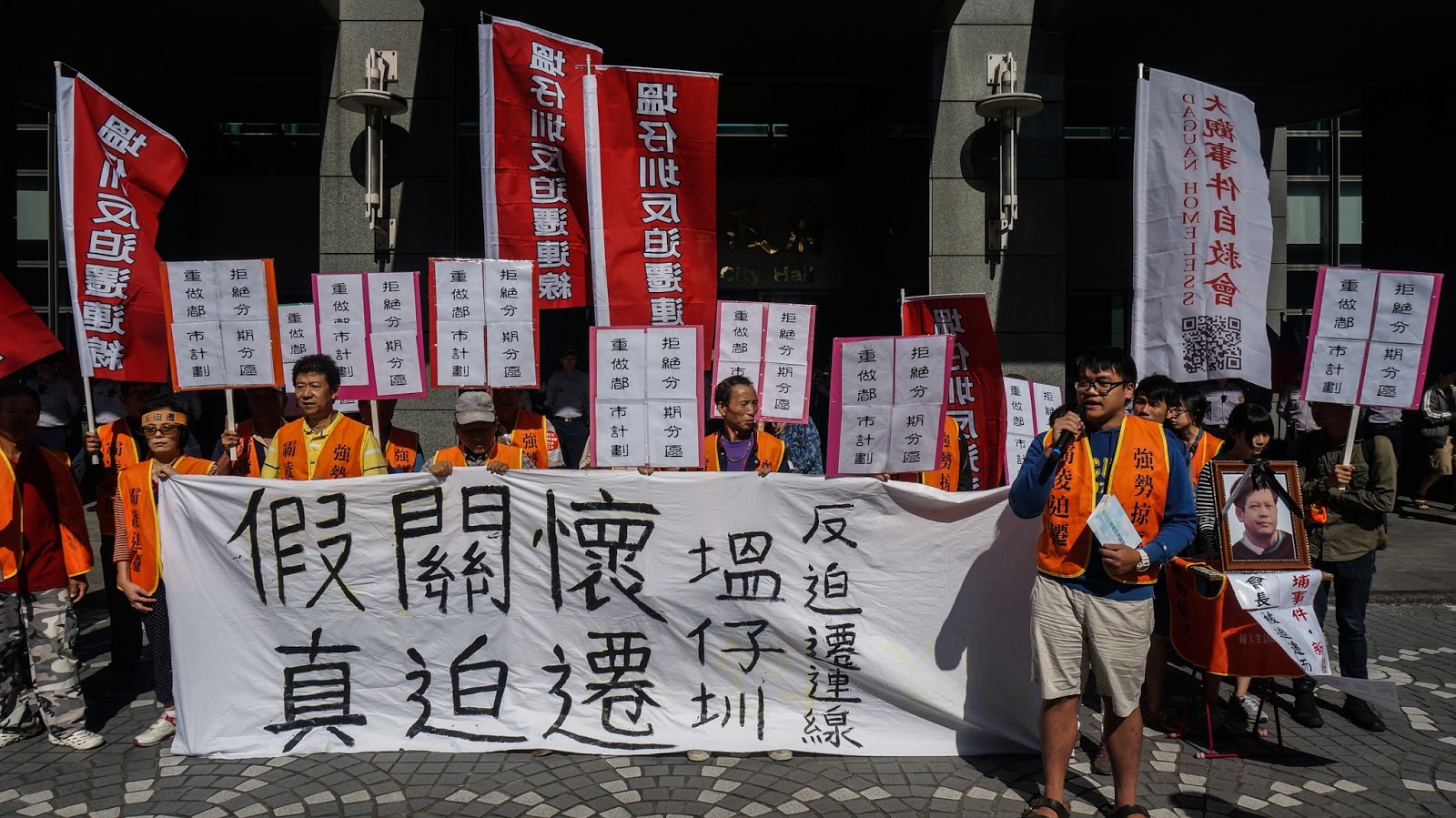 【記者王亦信專題】新北市政府十月底派出查視員拜訪當地工廠,打算以「分區分期」快速推動都市計劃案。此舉引發居民不滿,十月卅一日上午,抗議團體聚集在新北市政府大門口,大罵政府「假關懷、真迫遷」。