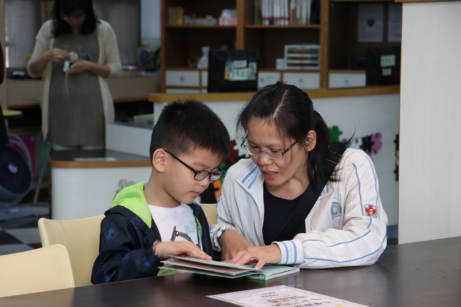 圖為一名母親在圖書館教導孩子如何閱讀。