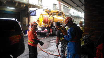 身著背心的新莊清潔隊水溝班人員,辛勤地為里民疏通家門前的下水道系統,替新莊地區維護良好的環境整潔。在水溝班有效率的協助下,下水道系統又恢復良好的排水功能。