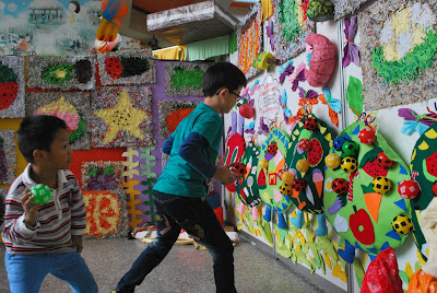 當天是中信國小運動會,也是一年一度全校藝術展的第一天。指導老師王婕嫣說,往年會指定製作材料或一位藝術家的藝術風格,將藝術作品鋪設在教學樓大廳;但今年寓教於樂,融合毛毛蟲生命歷程,由學生策劃一個完整的展覽。
