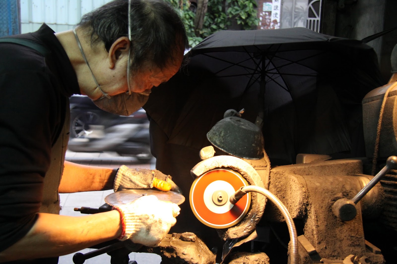 圖為新莊老街文山工具行老闆磨鋸畫面。